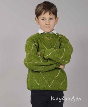 Зеленый пуловер для мальчика 7 лет связан спицами, описание и схемы вязания.