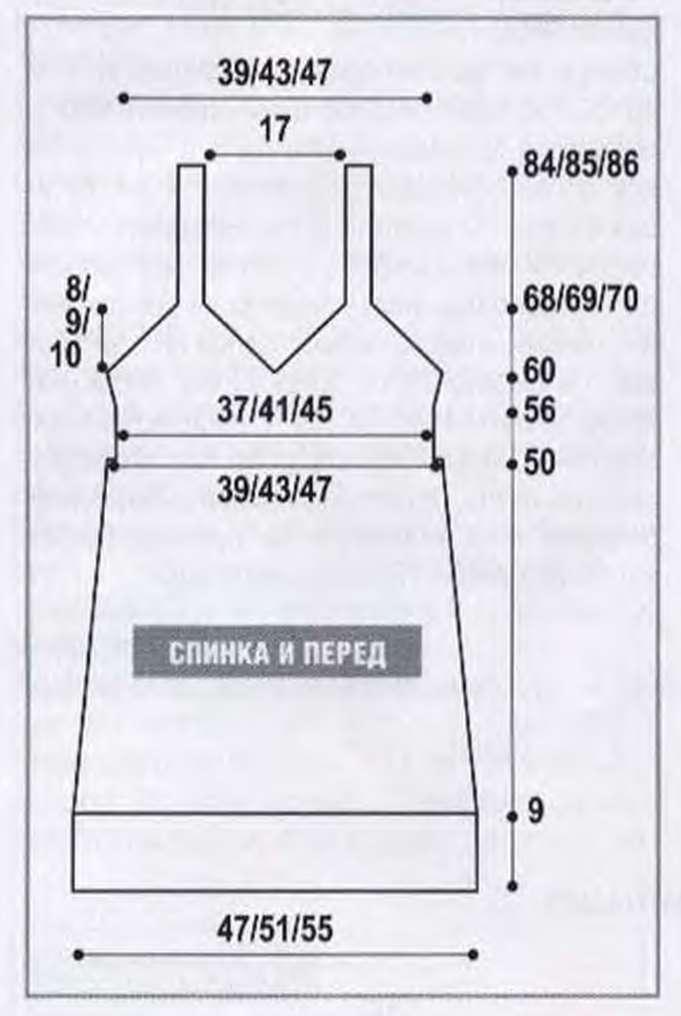 Вам потребуется: пряжа Anny Blatt: 7/8/9 мотков Odyssee (68% хпопка, 23% полиамида, 9% полиэстера, 136 м/50 г) бежевой меланжевой (188); 1/2/2 мотка Gyps Anny (65% вискозы, 35% полиэстера, 175 м/25 г) золотой (407); спицы №> 4; крючок No 3. Узоры: резинка 2/2, лиц. гладь, ст. б/н, ст. с/н . Резинка 1/4.1-й р.: *1 лиц., 4 изн,*; 2-й р.: *4 лиц., 1 изн/. Повторять 1-й и 2-й р. Резинка 3/2.1-й р.: *3 лиц., 2 изн/; 2-й р.: *2 лиц., 3 изн/. Повторять 1-й и 2-й р. Фантазийный узор: вязать по схеме, на которой приведены только нечетные ряды, четные ряды вязать по рисунку. Листики и цветок: вязать по соответствующим схемам. Ст. с/Зн: 3 накида, ввести крючок в 1 п., 1 накид, протянуть петлю, *1 накид, протянуть нить через 2 п/ 4 раза. Убавление 1 п. на расстоянии 2 п. от правого края: 2 п. лиц. гладью, 2 п. вместе с наклоном влево. Убавление 1 л. на расстоянии 2 п. от левого края: 2 п. вместе лиц., 2 п. лиц. гладью. Убавление 2 п. на расстоянии 2 п. от правого края: 2 п. лиц. гладью, 3 п. вместе с наклоном влево. Убавление 2 п. на расстоянии 2 п. от левого края: 3 п. вместе лиц., 2 п. лиц. гладью. 4 ст. с/н, провязанных вместе: '1 накид, ввести крючок в 1 п., 1 накид, протянуть петлю. 1 накид, протянуть нить через 2 п/ 4 раза, 1 накид, протянуть нить через 5 п., находящихся на крючке. Плотность вязания, резинка 2/2:24 п. и 30 р. = 10x10 см. Спинка/перед: набрать 115/129/143 п., связать 12 р. фантазийным узором, начиная и заканчивая 1 кром., закрыть петли. Связать крючком 1 р. ст. б/н Odyssee по ряду из закрытых петель; 1 p. Odyssee следующим образом: 3 возд. п., *1 возд. п., 1 ст. с/н*; 1 р. ст. б/н Gyps Anny; 5 p. Gyps Anny спедующим образом: 1-й и 3-й p.: 1 возд. п., *1 ст. б/н, 5 возд. п., пропустить 2 п/, 1 ст. б/н, получим 38/42/47 арок (Внимание! В1 -м р. арок для Р2 пропустить 2 х 3 п. вместо 2, выполнив 2 убавления, для РЗ пропустить 1 х 3 п. вместо 2, выполнив 1 убавление), 2-й и 4-й р.: 5 возд. п., Ч ст. б/н, 5 возд. п., пропустить 2 п/. 1 ст. б/н, 2 возд. п., 1 ст. с/н в ст. б/н предыдущего ряда, 5-й р.: 3 ст. с/н в каждую арку предыдущего ряда. Связать крючком 1 р. ст. б/н Odyssee, равномерно убавив 3/7/11 п. Останется 112/122/132 п. На спицы набрать петли, вводя спицу в каждый ст. б/н и вязать резинкой 2/2, начиная с 1/2/1 лиц. Убавить с обеих сторон на расстоянии 2 п. от края 9 х 1 п. в каждом 12-м р. Останется 94/104/114 п. На высоте 50 см продолжить резинкой 1/4, начиная с 3 изн. и равномерно убавив 7 п. в 1-м р. Останется 87/97/107 п. На высоте 56 см продолжить резинкой 3/2, начиная с 2 изн. Прибавить с обеих сторон 4 х 1 п. в каждом 2-м р. Получим 95/105/115 п. На высоте 60 см закрыть с обеих сторон в каждом 2-м р. для Р11 х 3 п., убавить на расстоянии 2 п. от края *1 х 2 п., 1 х 1 п/ 5 раз, 1 х 2 п., для Р2 1 х 3 п., убавить на расстоянии 2 п. от края 4 х 2 п., *1 х 2 п., 1 х 1 п/ 4 раза, 1 х 2 п., для РЗ 1 х 3 п., убавить на расстоянии 2 п. от края 11x2 п., 1 х 2 п., 1 х 1 п., 1 х 2 п. На высоте 60/61/62 см закрыть для выреза горловины центральные 3 п. и далее вязать каждую часть отдельно, убавляя со стороны горловины в каждом 2-м р. на расстоянии 2 п. от края *1 х 2 п., 1 х 1 п/ 5 раз, 1 х 2 п.. 2 п. вместе с накпоном впево. Далее вязать лиц. гладью на оставшихся 7 п., формируя бретели. На высоте бретелей 16 см оставить петли на спице. Сборка: см. рекомендации по сборке на стр. 26; соединить оставленные петли бретелей, расположив их лиц. стороной друг к другу и провязывая их по две вместе изн. Связать Gyps Anny 1 цветок и 2 листика, пришить их спереди (см фото). Выпопнить боковые швы. Низ туники, горловину спинки и переда, а также проймы обвязать крючком 1 р. ст. б/н Gyps Anny, 1 p. Gyps Anny следующим образом: *3 ст. б/н, 1 возд. п., 4 ст. с/н, закрытых вместе, из одн