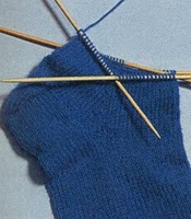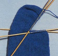 Поднимаем пяточные петли: чтобы продолжить вязку для стопы кругами, необходимо поднять пяточные петли с краев пяточной стенки и по 1 петле из поперечной нитки между 1-й и 2-й спицами, соответственно между 3-й и 4-й спицами. Проще всего сделать это следующим образом: в конце последнего лицевого ряда вставлять спицу всегда под обеими частями кромочной петли пятки по направлению снаружи внутрь и доставать нитку, как в лицевой петле. Когда все пяточные петли одной стороны подняты, провязываются оставленные петли 2-й и 3-й спицы лицевыми или любым рисунком. После этого также поднимаются петли другой стороны.