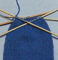 При вязке пятки и пяточного дна важно следить за спицами. Круг всегда начинается в середине носка с тыльной стороны. Для вязки пяточной стенки используются только спицы 4 и 1 (перед и после начала круга). Петли на спицах 2 и 3 фиксируются булавками или колпачками на спицах. Вяжите петли 1-й и 4-й спиц лицевой гладью (лицевые ряды лицевыми, изнаночные ряды изнаночными).