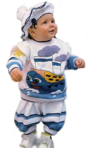 Вам потребуется; 200 г пряжи голубого, 50 г белого цвета (100% акрил; 216 м/50 г), остатки пряжи разных цветов; 10 синих пуговиц; спицы № 2 и 2,5; круговые спицы № 2,5, 2 чулочные спицы № 2.5.