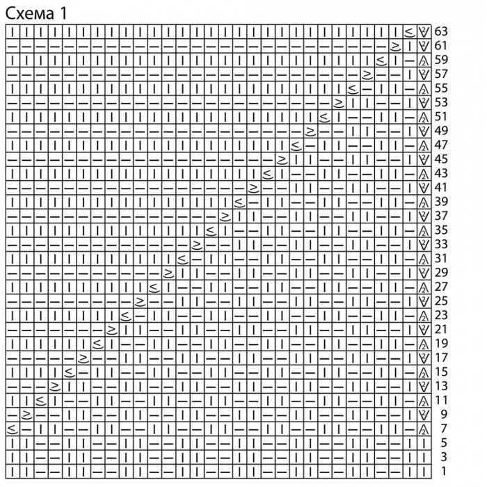 Вязать согл. схеме 1. Выполнить 1 раз 1–64-й ряды.