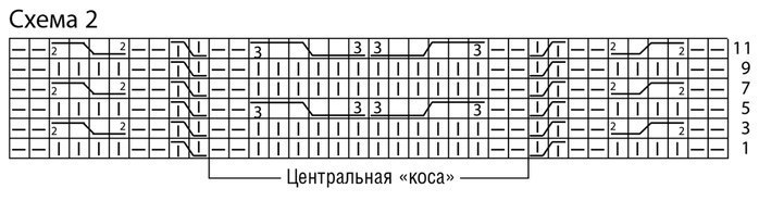 Для дальнейшего скоса рукава прибавить с обеих сторон в каждом 10-м ряду от смены центральной «косы» x 1 п. согл. узору = 76 п.