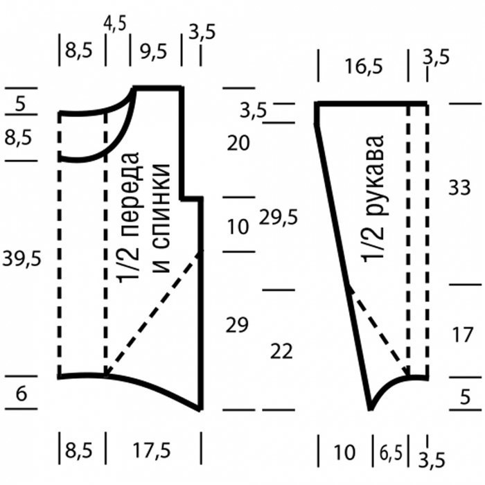 Через 53 см = 148 рядов от планки (измерять посередине) или через 59 см = 148 рядов (измерять по боковым краям) закрыть оставшиеся по 17 п. плеч.