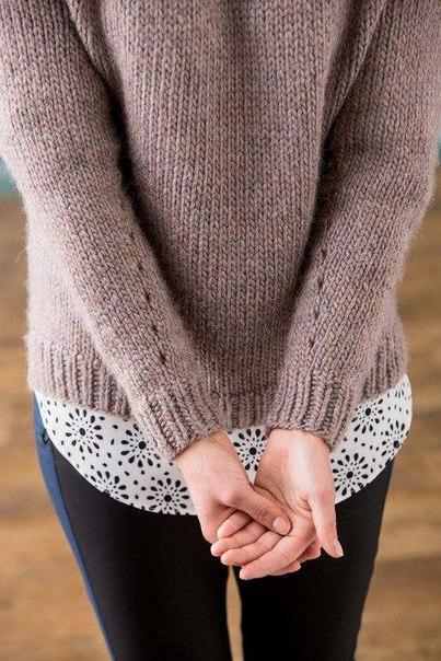 Нижние кромки резинкой для этого пуловера выполняются отдельно плоским полотном, затем соединяются и корпус выполняется вкруговую до нижней проймы. Рукава также выполняются отдельно вкруговую. Рукава и корпус соединяются для вязания кокетки вкруговую.