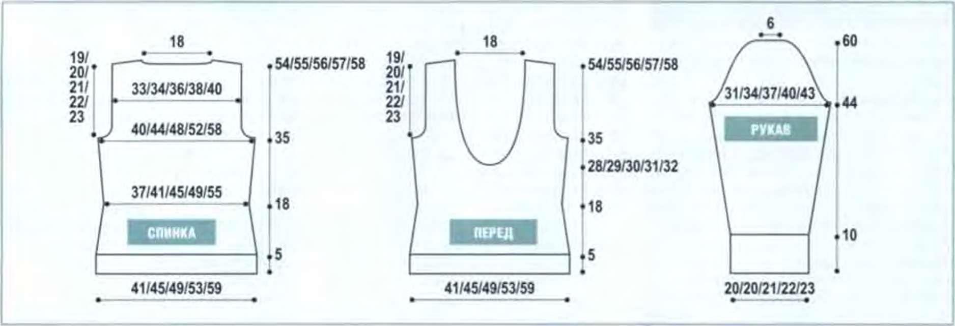 Перед: вязать, как спинку, кроме горловины На высоте 28/29/30/31/32 см закрыть для выреза горловины центральные 12 п.. затем закрыть с внутренней стороны 4 х 1 л. в каждом 2-м р.. 4 х 1 п. в каждом 4-м р. На высоте 54/ 55/56/57/58 см формировать скосы плеча закрывая в каждом 2-м р. для Р1 3 х 4 п.. для Р2 х 5 п., 2 х 4 л . для РЗ 3 х 5 л. для Р4 1 х 6 п., 2x5 п., для Р53х6п.