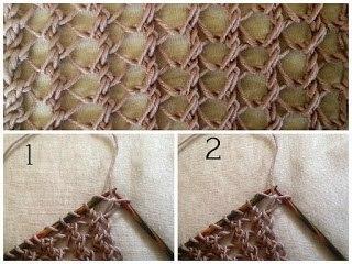 Кромочная петля; *1 петлю переснять на правую спицу, как изнаночную; следующую петлю провязать изнаночной и протянуть через снятую петлю; воздушная петля*; кромочная петля.