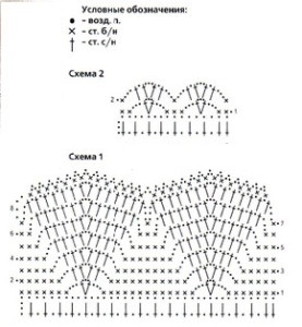 Для вывязывания нижней каймы нужно набрать нужное количество воздушных петель и вязать по схеме 1. А кайму для украшения карманов следует вязать по схеме 2. Используйте также пряжу "Ирис" и крючок №1,3. Схемы для вязания помещены ниже.