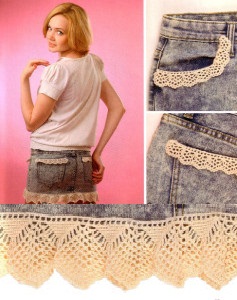 Украшение джинсовой одежды вязаными деталями очень модно в последнее время. Яркая кайма, ажурные сборки, интересные заплатки симпатично смотрятся, как украшение джинсовой одежды.