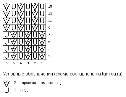 В первых четырех нечетных рядах две петельки вместе провязываются лицевой снизу, а в следующих четырех нечетных рядах две вместе исполняются лицевой сверху.