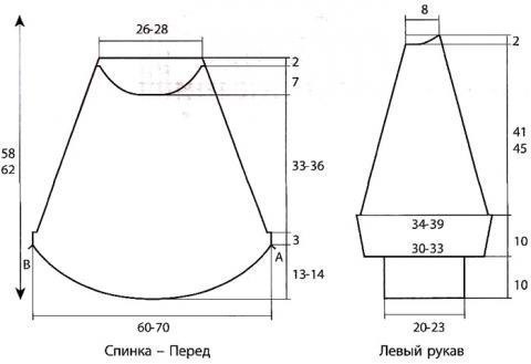 Сборка: пришить швом «петля в петлю» планки к низу пуловера от точки А до точки В (см. выкройки). Выполнить швы регланов. Пришить швом «петля в петлю» воротник к вырезу горловины и сшить короткие края воротника, выполнив 10 см шва по лиц. стороне полотна для отворота. Выполнить швы рукавов и боковые швы пуловера. Новые схемы крючком и спицами вязанной одежды.